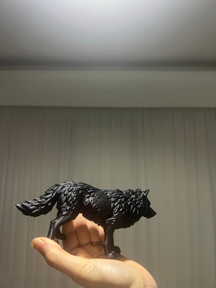 Detaylı tüy dokusu ve gerçekçi duruşa sahip siyah kurt figür