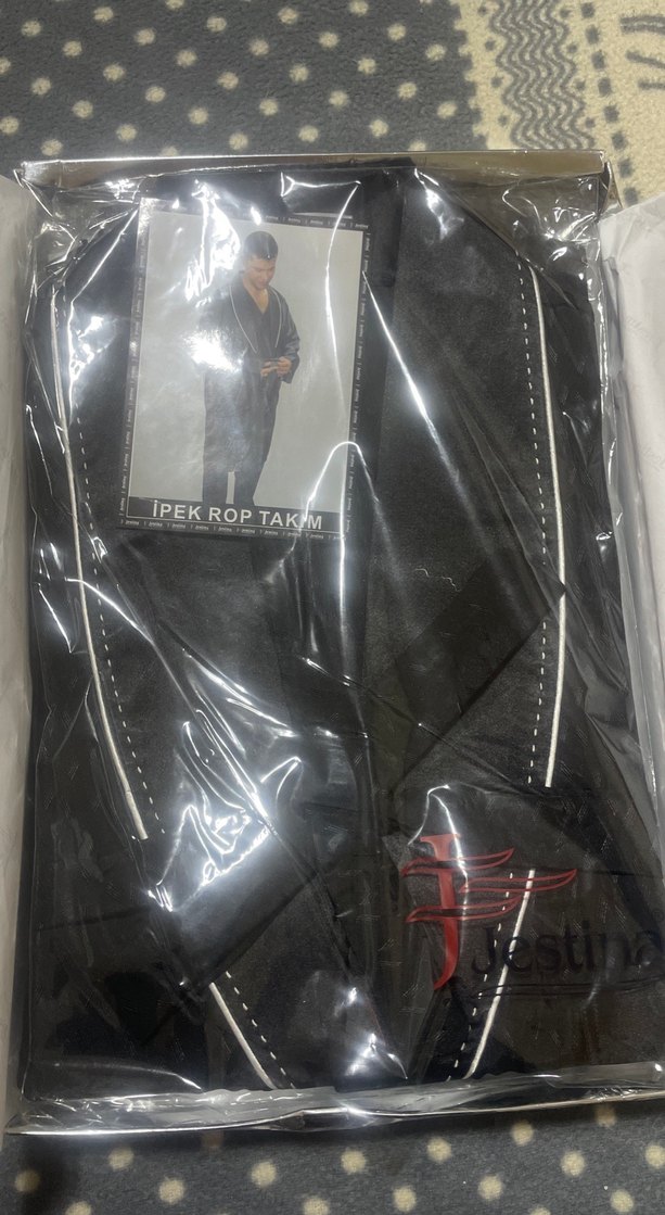 Siyah, uzun kesim erkek pijama takımı, yakalı ve baskılı desenlidir. Kuşaklı ve askılı kollu, rahat kesimdir. IPEKROPTAKM markalıdır. Çeyizden kalma hiç kullanılmamıştır pijama takımı artı sabahlığı vardır Saten kumaş