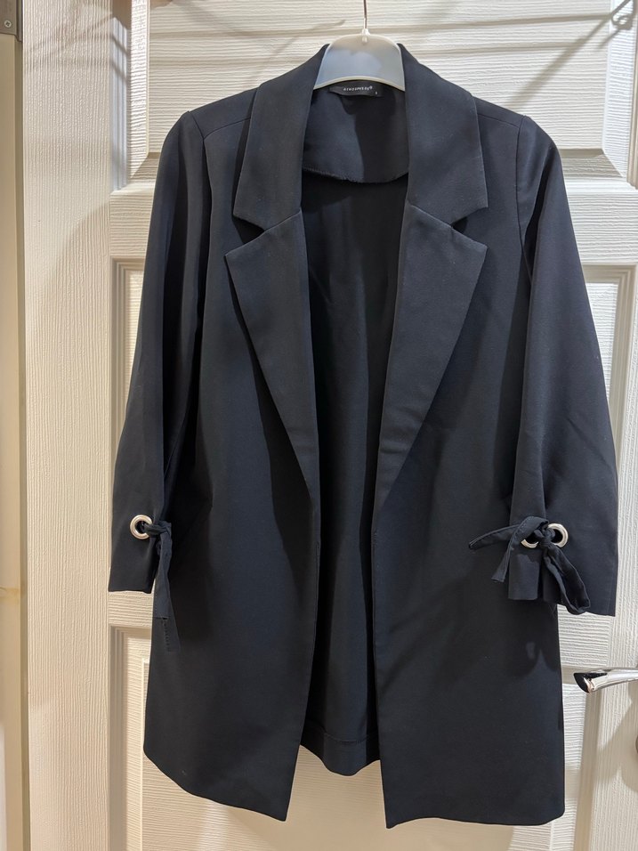 Uzun kesim, kuşaklı ve askılı kollu siyah kadın blazer ceket, ipeksi kumaştan üretilmiş, rahat kesim ve iş ortamı için uygun. Tesetture uygundur. Popoyu kapatiyor.