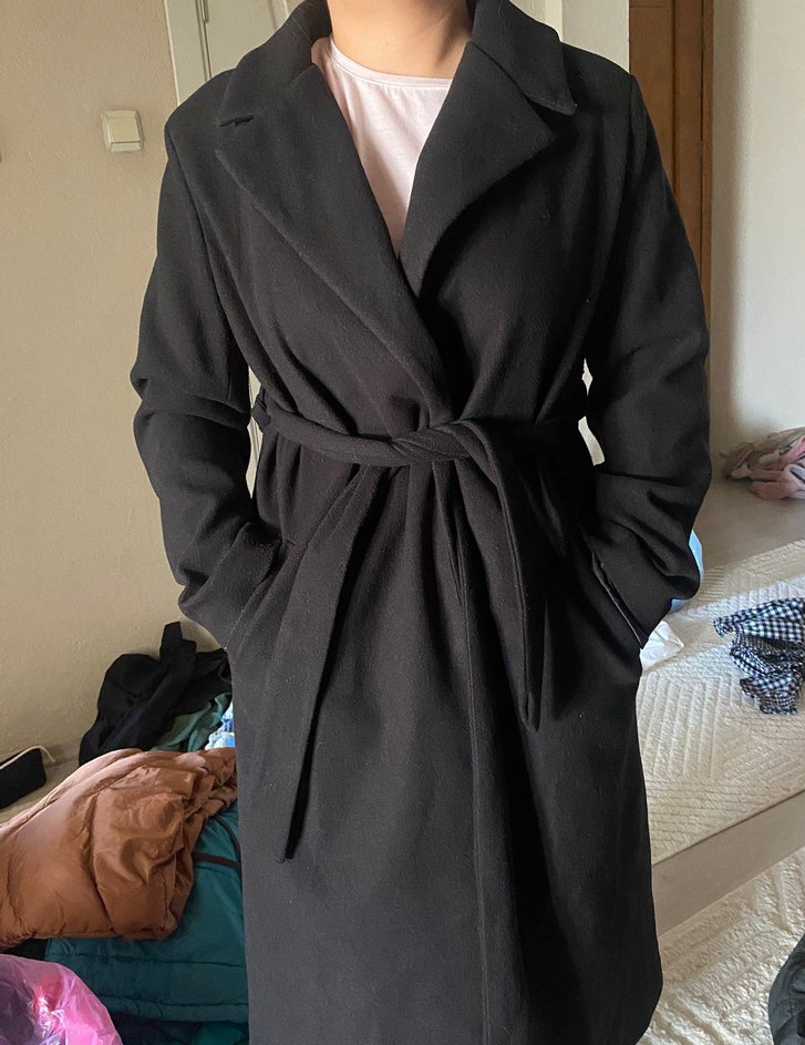 Siyah kuşaklı kaban, yumuşak ve sıcak kumaştan, uzun kollu ve yaka detaylıdır. Yan cepleri vardır.