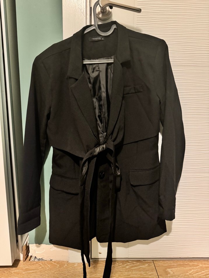 Siyah Kuşaklı Midi Blazer Ceket