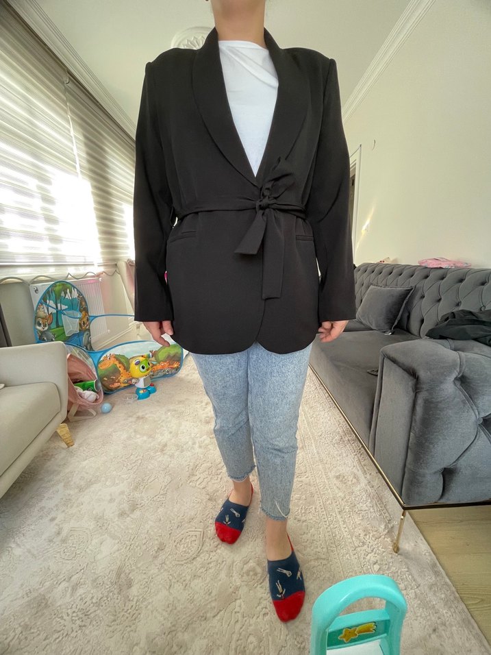 Siyah denim kumaştan, kuşaklı ve yaka detaylı, uzun kollu, bol kesim midi blazer. Ofis ve günlük sokak stili için uygun. 1 kez giyildi