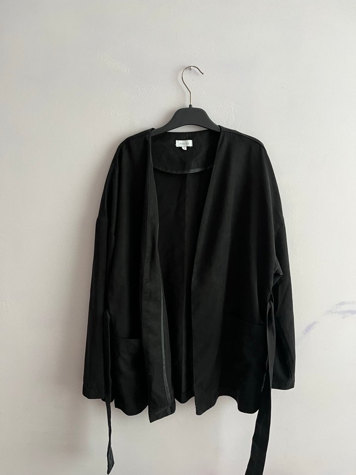 Siyah, kuşaklı, normal uzunlukta midi kadın. Notch yaka ve uzun kollu, bol kesim, yumuşak ve ipeksi kumaştan üretilmiştir.