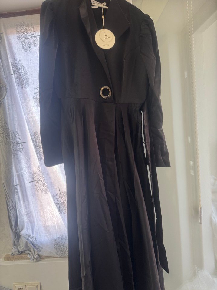 Siyah, uzun kollu, kuşaklı ve yakalı uzun kadın abiye İpeksi dokusu ve regular kesimiyle düğün nişan için uygunfur Paris tarzını yansıtır.
