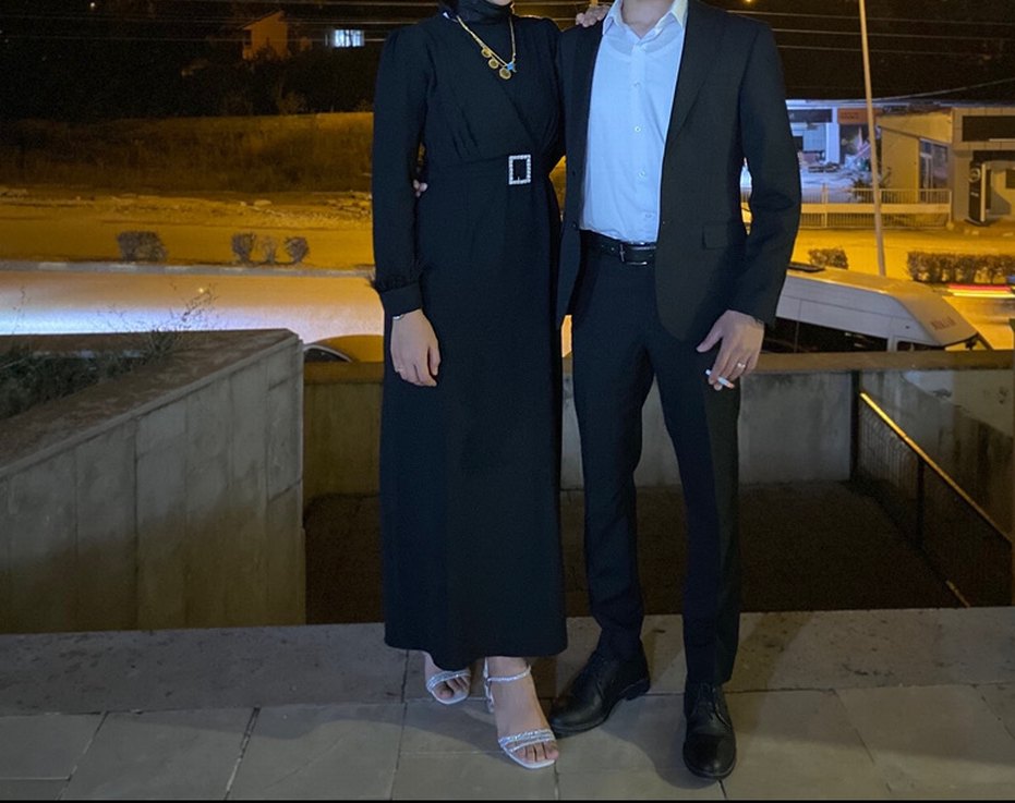 Siyah uzun elbise, kuşaklı bel ve kesimli yakasıyla modest ve şık bir görünüm sunar. İnce askılı kollara sahip, romantik akşamlar için uygun.
