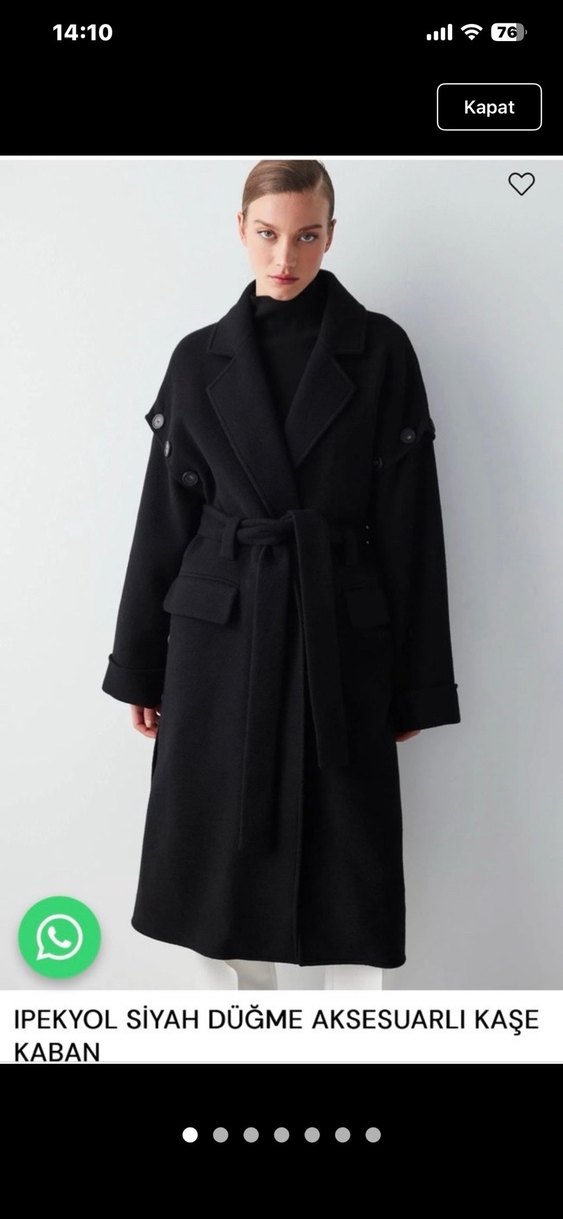 Siyah uzun kaban, kuşaklı bel ve kollarda düğme detaylarına sahiptir. Geniş yakalı ve önünde kapaklı cep bulunur.