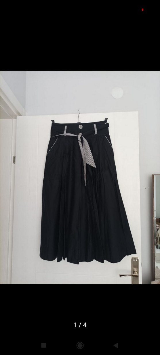 Siyah, kuşaklı ve uzun boy kadın eteği, bol kesim ve ipeksi dokusuyla dikkat çeker. Desensiz, gotik ve Paris tarzına uygundur.