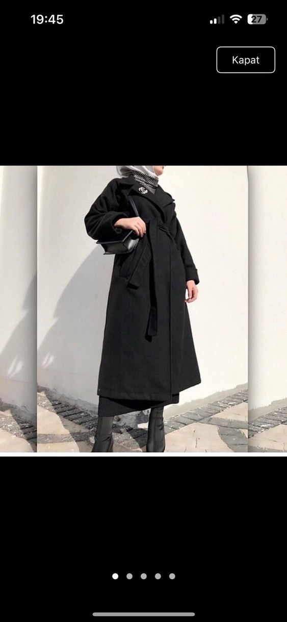 Bu uzun siyah kaban, kuşaklı ve yakalı olup, bol kesimdedir. Yumuşak ve sıcak kumaştan yapılmış, askılı kollu ve desensizdir. KOL altında bir sökük var terziye gitmedim elimle diktim. Bu yüzden fiyatı uygun tuttum.