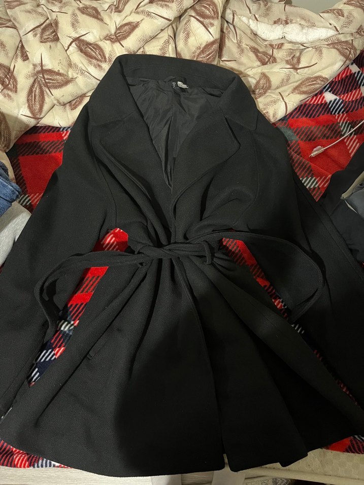 Siyah, kuşaklı ve uzun kollu kadın kabanı, sentetik kumaştan üretilmiştir. Notch yaka ve desenli tasarımıyla gotik sokak stili sunar.