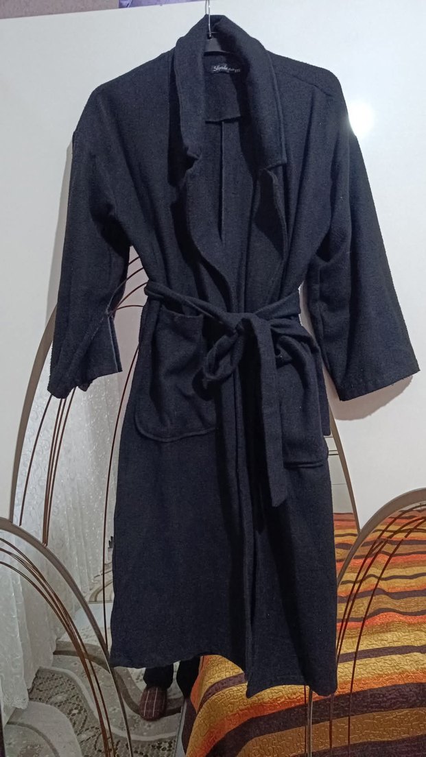 Yumuşak dokulu, kuşaklı ve büyük ön cepleri olan siyah uzun kaban. Serin havalar için uygundur. Bol kesim