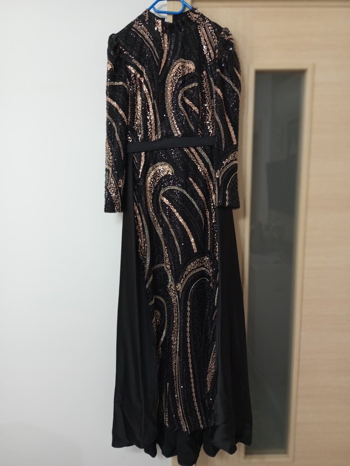 Kuyruklu uzun abiye elbise, desenli koyu renk ve drapeli detaylara sahiptir. Uzun kollu, yuvarlak yaka ve çağdaş tarzdadır.