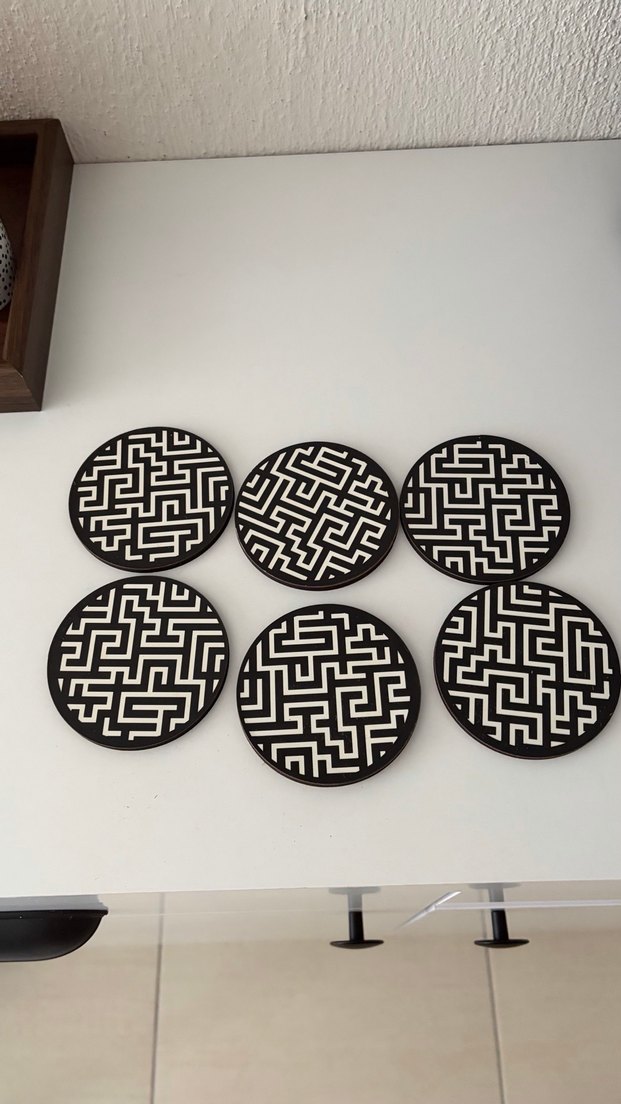 Yüzeyi koruyan, beyaz labirent desenli siyah 6 adet bardak altlığı seti. Her biri farklı labirent deseni içerir. Hiç kullanılmamıştır ihtiyacım dışı satılıktır