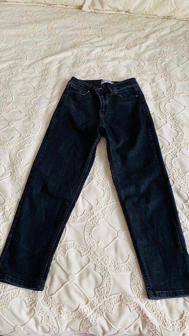 Siyah denimden, normal boy ve normal kesim olan, bağcıklı detaylı kadın kot pantolon. Minimalist ve desensiz, günlük kullanıma uygun.