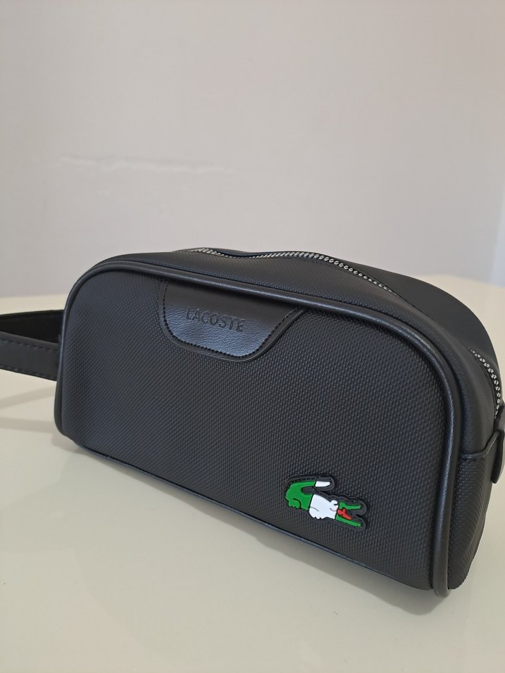 Siyah renkli, baskılı dokulu Lacoste erkek el çantası. Fermuarlı kapama ve küçük timsah logosu bulunur. Trendy casual ve iş tarzına uygundur.