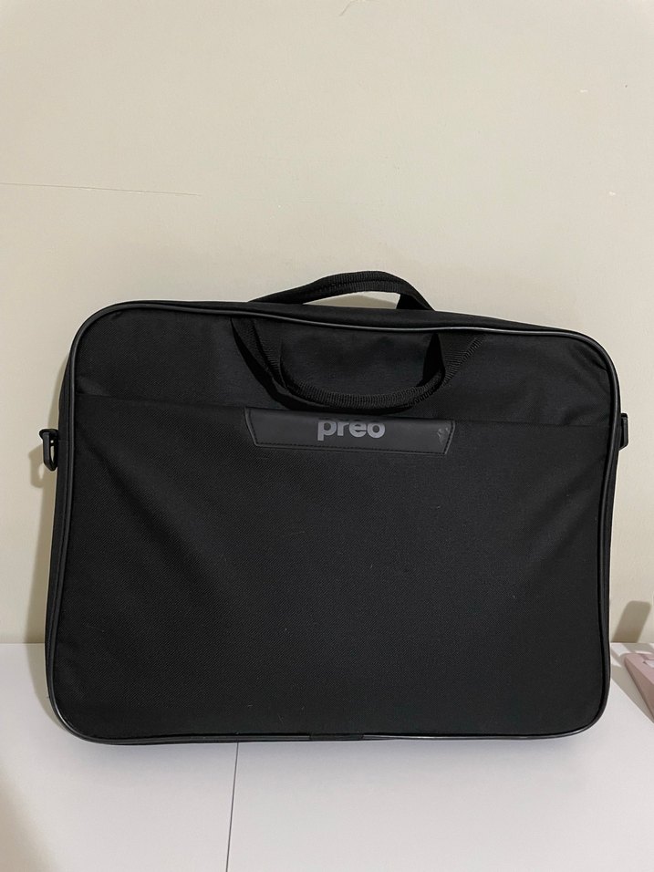 Sentetik kumaştan yapılmış, fermuarlı siyah laptop çantası. İş ve ofis kullanımı için uygun, sade ve desen içermeyen tasarım, Preo markalı.