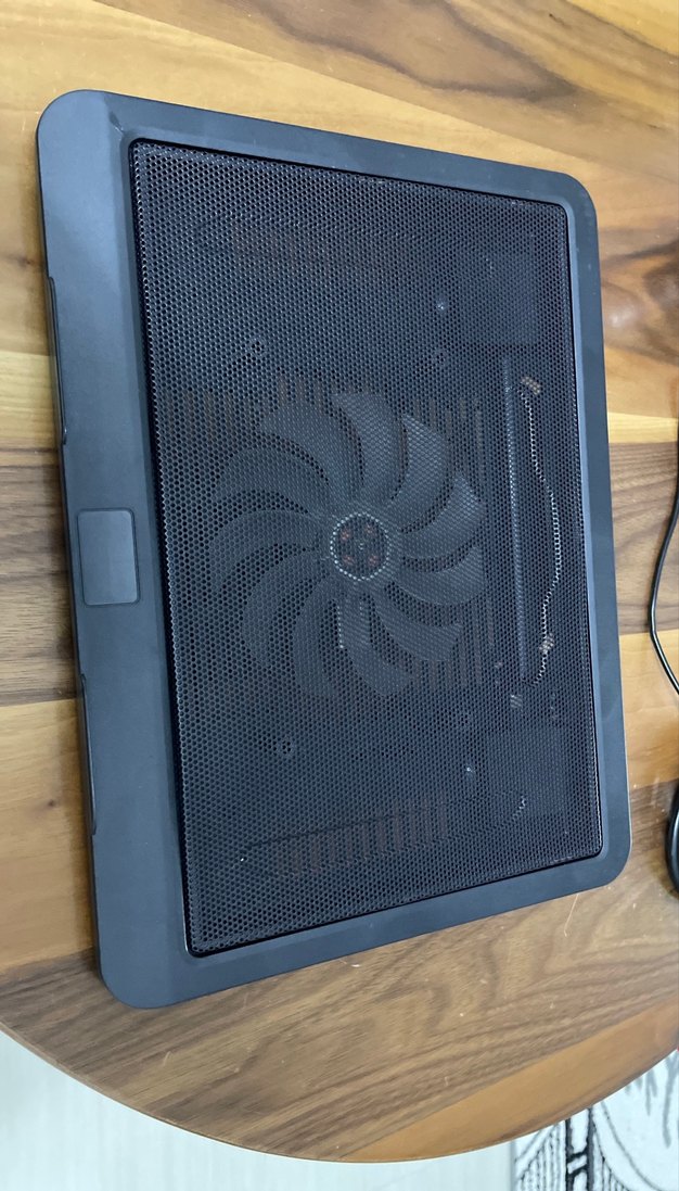Siyah renkli laptop soğutucu fan, geniş merkezi fan ve hava akışını sağlayan file yüzeye sahiptir ısıklı