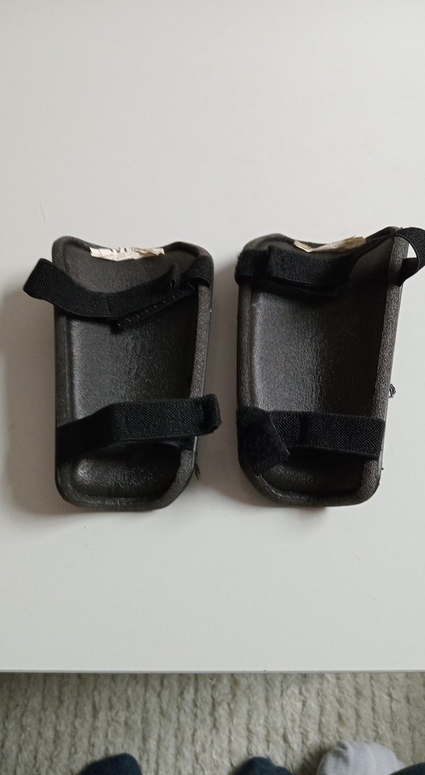 Siyah lastik motosiklet diz koruyucuları, ayarlanabilir cırt cırt bantlarla güvenli tutuş sağlar. Desensiz ve koyu renkli, biker tarzında.