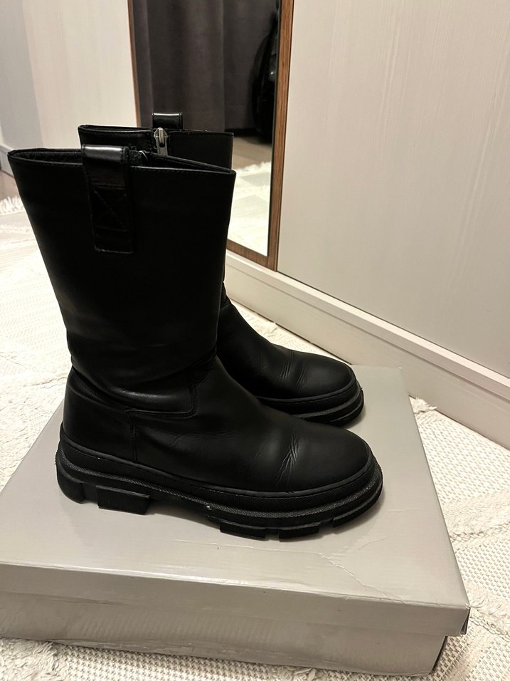 Hotiç marka iç dış deri tam kalıp Siyah lastik platform topuklu botlar, tokalı detaylara sahip, gotik stil ve rock punk havası ile günlük kullanıma uygun.39 numara tam kalıptır.