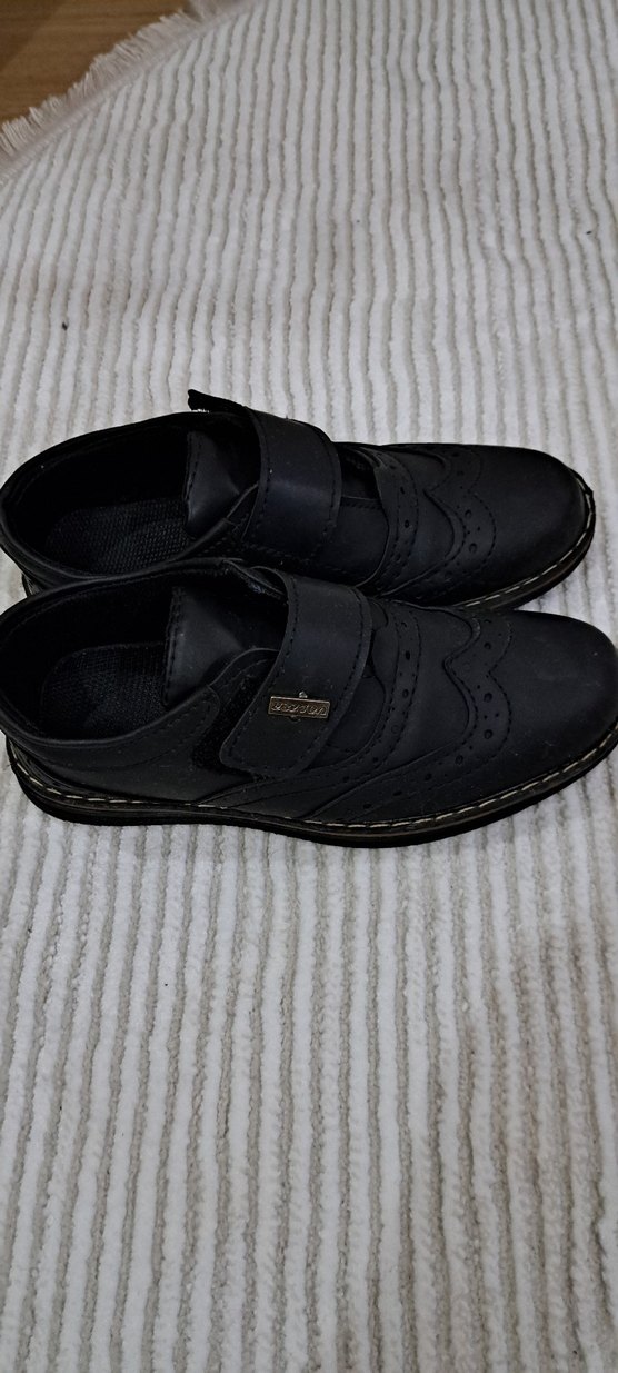 Siyah lastik malzemeden yapılmış, tokalı ve desensiz erkek çocuk ayakkabısı. Düz, sade ve gotik tarzda, koyu renkte.