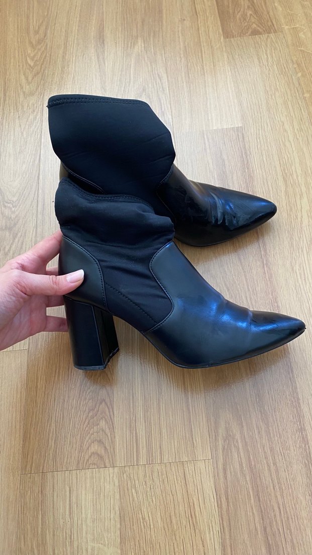 Lastikli üst kısmı ve blok topuklu siyah kadın botları. Kauçuk malzemeden, sivri burunlu ve desen içermeyen tasarımı ile ofis için uygundur.