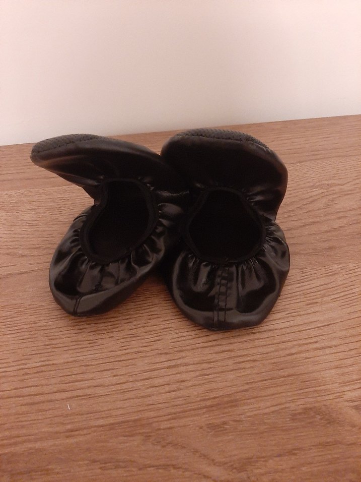 Siyah lastikli çocuk balerin ve pisi ayakkabısı, düz yüzeyli ve gotik tarzda, kauçuk benzeri malzemeden üretilmiştir.