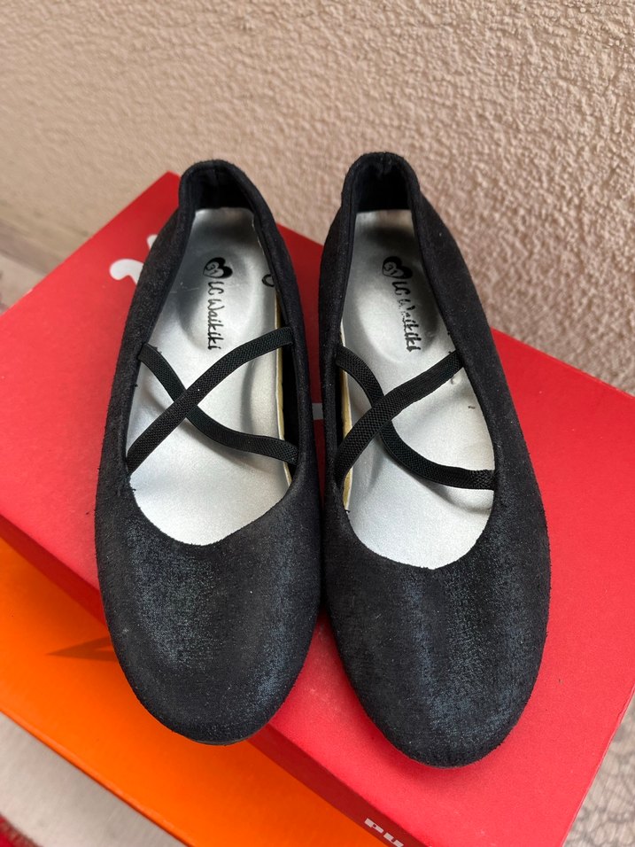 Siyah renk, lastikli bantlı kız çocuk babet ayakkabı. Kauçuk tabanlı, goth tarzında şık bir tasarım. Ayağımız büyüdüğü için hiç kullanılmadı #kızçocukbabet #babet #zara #koton #bambi #lcwaikiki