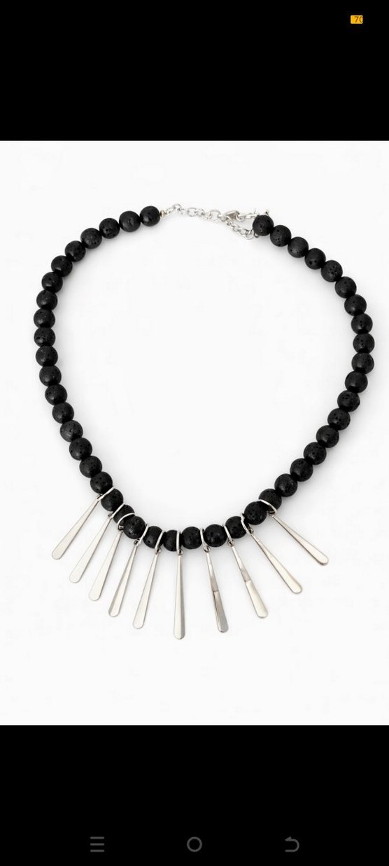 Siyah boncuklardan oluşan, gümüş detaylı çağdaş ve minimalist tasarıma sahip midi uzunlukta kolye. Günlük kullanım için uygun, rock punk havası verir.
