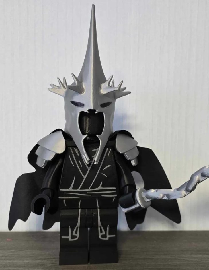 Uzun sivri miğferli, omuz zırhı ve pelerinli siyah Lego karanlık lord figürü, elinde asa ile. ♂️