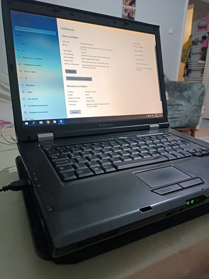 Siyah Lenovo dizüstü bilgisayar, klasik klavye düzeni ve sistem bilgilerini gösteren ekran ile temel bilgisayar işlevlerini sunar. Yanında soğutucu, şarjı ve mause ile vereceğim biraz ağır çalışıyor genel anlamda çalışıyor ama dediğim.gibi yavas onun harici bir problemi yok . Çocuğunuza ve evrak not etme için kullanabilirsiniz .