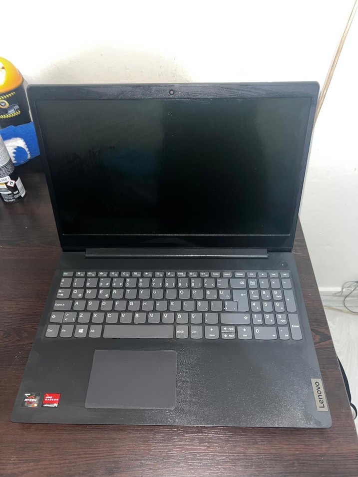 Tam klavye ve sayısal tuş takımına sahip siyah Lenovo dizüstü bilgisayar. Dahili web kamerası ve AMD Ryzen işlemci içerir.