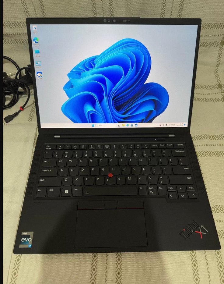 İnce çerçeveli ekrana, tam klavyeye ve Intel Evo işlemciye sahip siyah Lenovo ThinkPad X1 laptop. Windows 11 işletim sistemi bulunur.