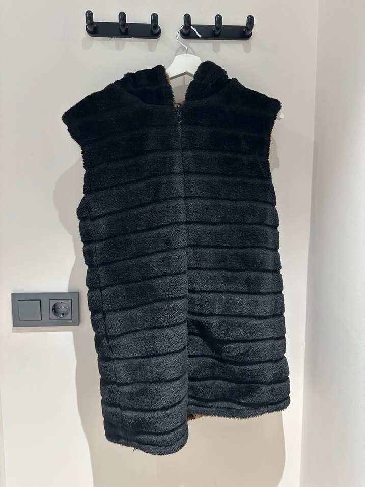 Kapşonlu siyah-leopar çift taraflı kürklü yelek