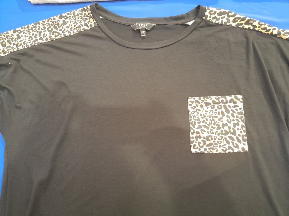 Siyah renkli, yuvarlak yaka ve kısa kollu hamile tişörtü. Omuz ve cepte leopar desenleri bulunur, rahat kesimlidir.