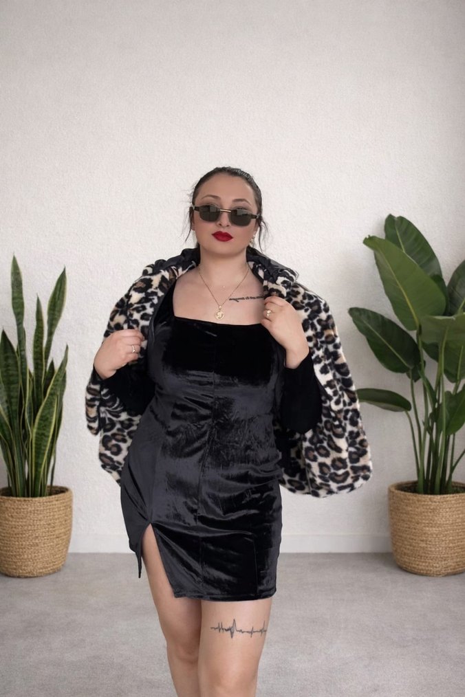 Siyah kadife kumaştan, straplez yakalı ve uzun kollu, leopar kürk detaylı, vücuda oturan görünüme sahip glam gotik tarzda elbise.