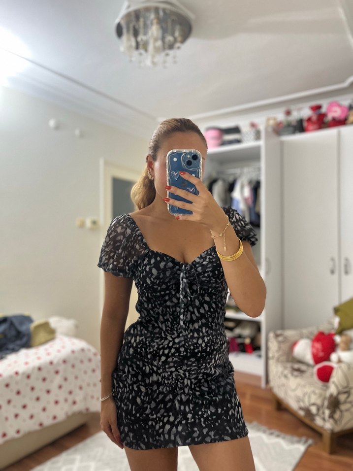 Siyah Leopar Desenli Mini Elbise