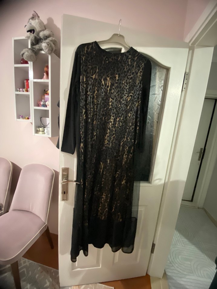 Siyah leopar desenli, uzun ve salaş kesim elbise. Uzun kollu, yüksek yakalı ve dökümlü tasarıma sahiptir.arkasında ve önünde siyah tül vardır. Sadece bir kez kızımın kınasında giydim