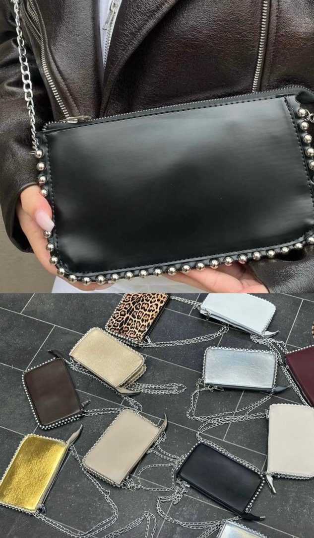 Leopar desenli, zincir detaylı siyah deri çanta, kenarları tokalıdır. Rock punk tarzıyla günlük kullanıma uygundur.