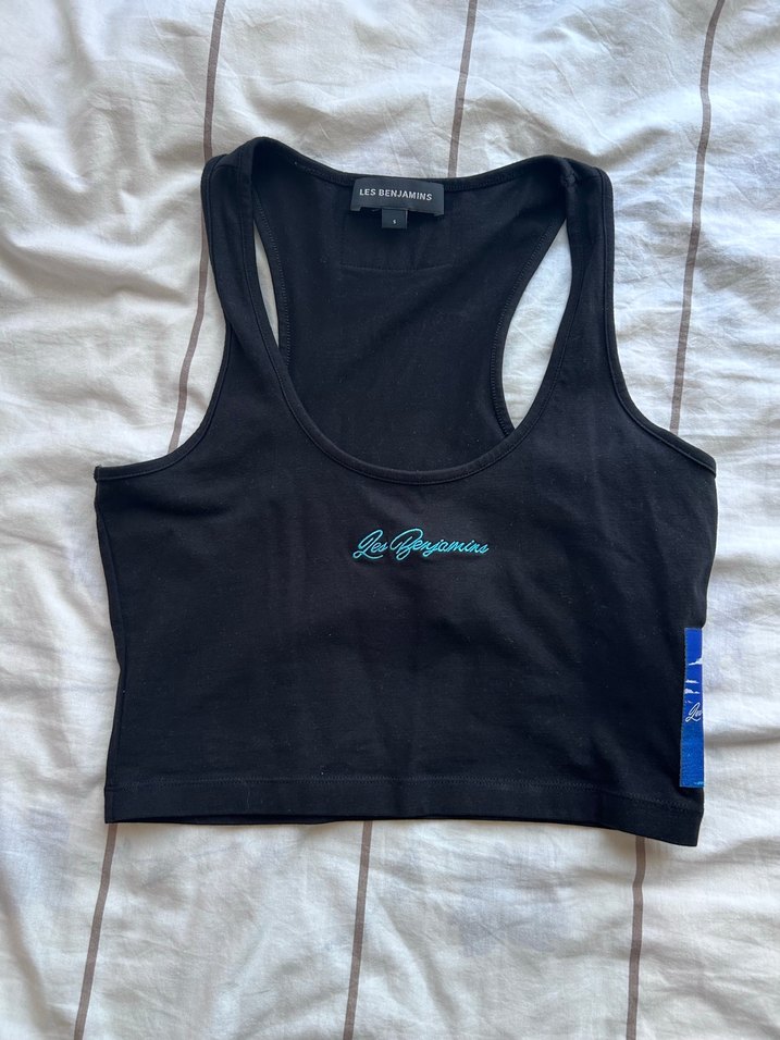 Siyah, pamuklu kumaştan, baskılı logo detaylı, dar kesim kadın crop top, spor ve gündelik kombinlere uygun.