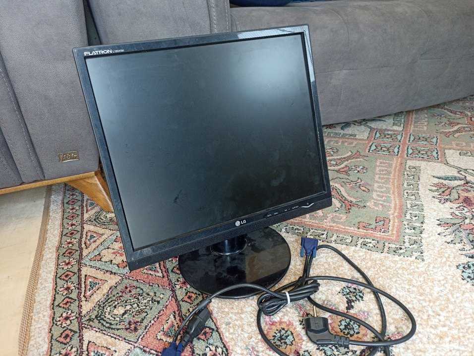 Siyah LG monitör, kare ekran ve VGA kablosu ile birlikte. Temel bilgisayar ihtiyaçları için uygundur. ️