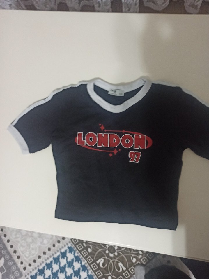 Pamuklu, kısa kollu, london baskılı esnek kumas crop