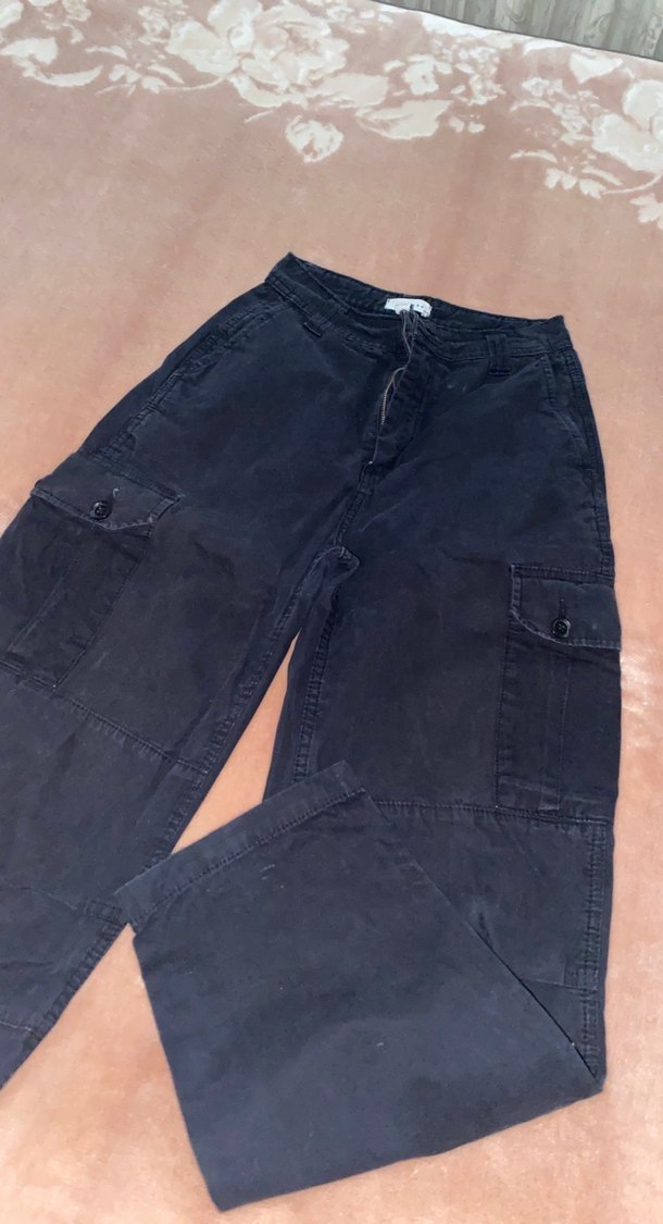 Siyah renk, loose fit kesim ve yan cep detaylı denim pantolon. Günlük kullanım için rahat ve şık bir sokak stili parçası. kargo pantolon