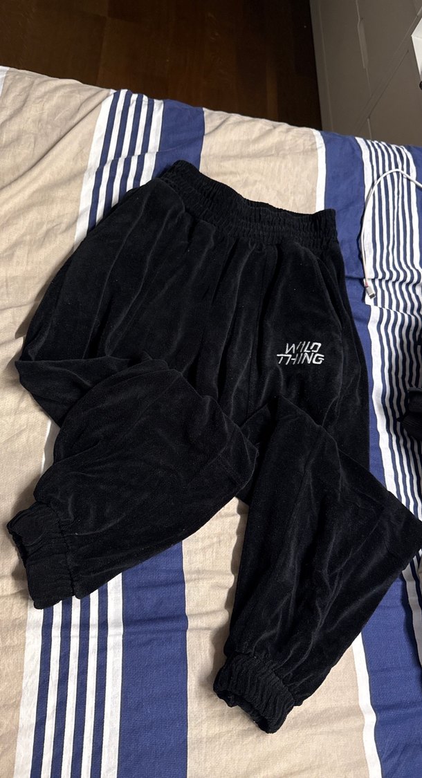 Siyah, yumuşak dokulu kadife kumaştan, elastik bel ve paçalarla, "WILD THING" baskılı rahat kesim eşofman altı.