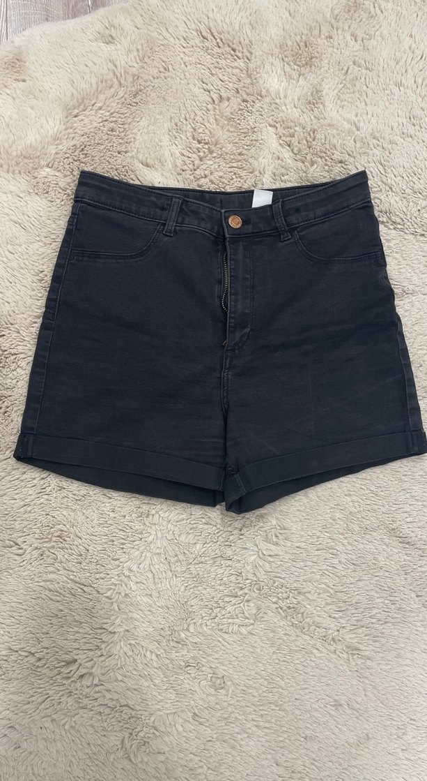 Siyah renkli, yüksek bel mini denim şort, rahat ve şık sokak stiline uygundur. Günlük kullanıma idealdir. s-m uyumlu