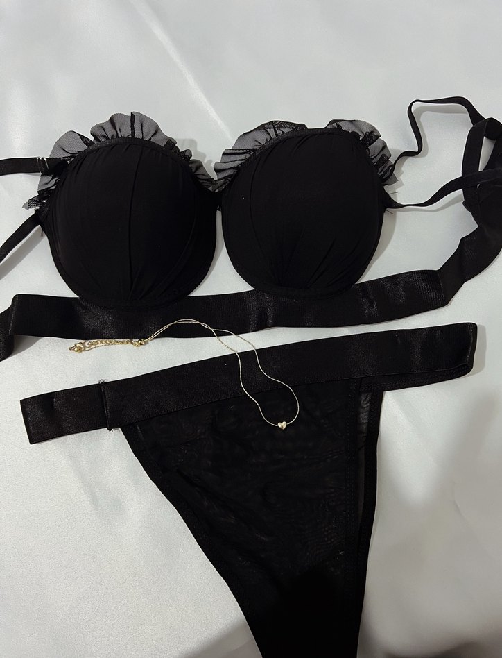 Siyah renkli, kısa uzunlukta goth sütyen ve külot takımı, fırfırlı kenarlarla sade ve desensiz kumaştan yapılmıştır. Ayarlanabilir askılara sahiptir. 80-85-90 bedenleri mevcuttur. Hijyen nedeniyle iade kabul edilememektedir.