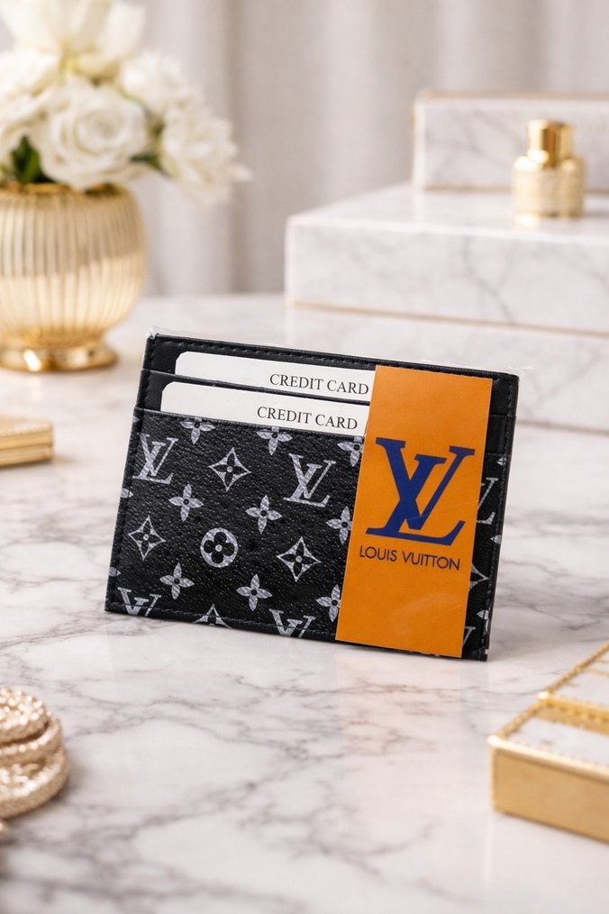 Siyah suni deri cüzdan, Louis Vuitton baskılı desene ve cırt cırtlı kapanışa sahiptir. Modern klasik ve Paris tarzını yansıtan cüzdan, günlük kullanıma uygundur ve kredi kartı bölmeleri bulunur.