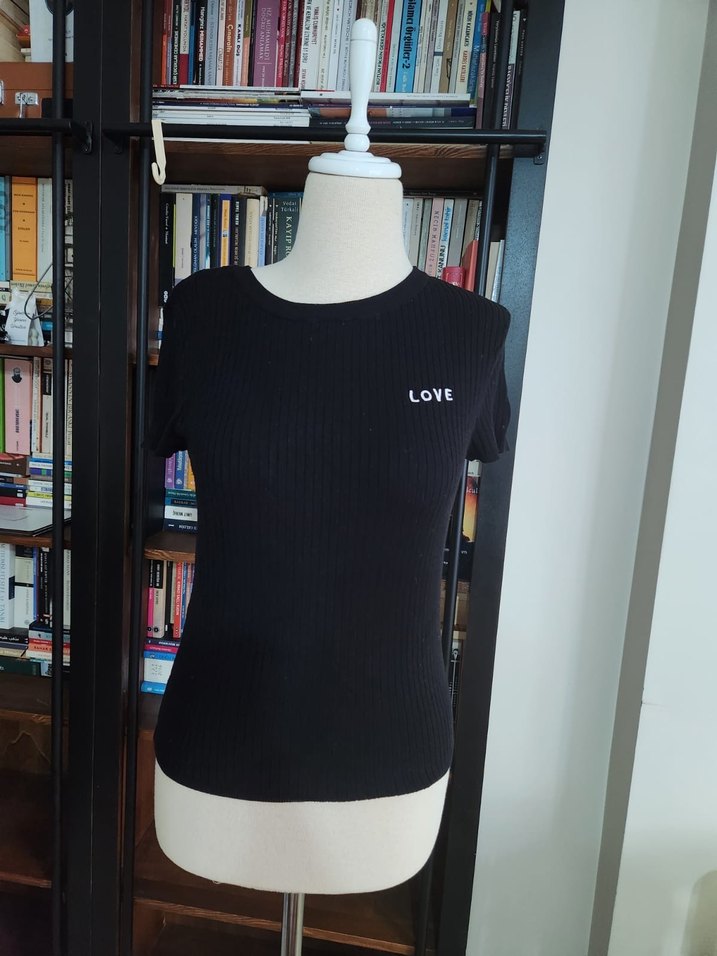 Siyah, kısa kollu, yuvarlak yaka, vücuda oturan örme tişört. Önünde küçük 'LOVE' baskısı bulunur. Günlük kullanıma uygun goth tarzı.