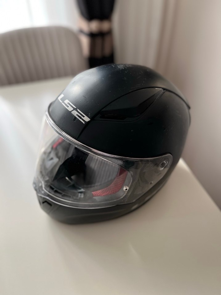 Siyah LS2 marka, desen içermeyen, tokalı ve şeffaf vizörlü plastik malzemeden yapılmış minimalist biker kask. ️