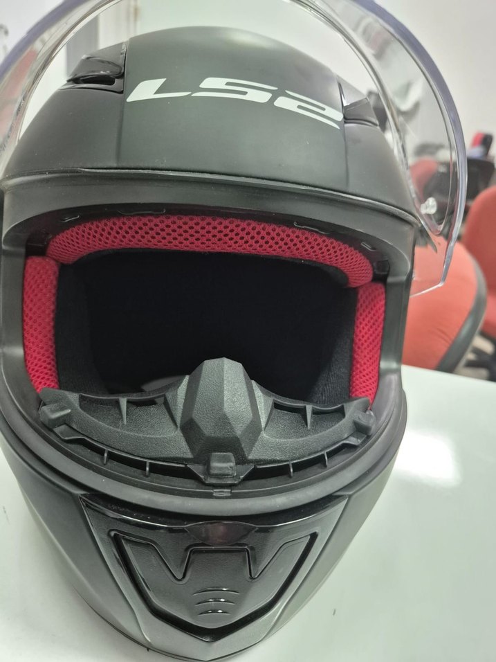 Velcro bantlı siyah LS2 motosiklet kaskı, plastik malzemeden üretilmiş. Şeffaf vizör ve kırmızı iç ped ile sokak tarzı ve rock punk havasına uygun. ️. sıfır ayarında