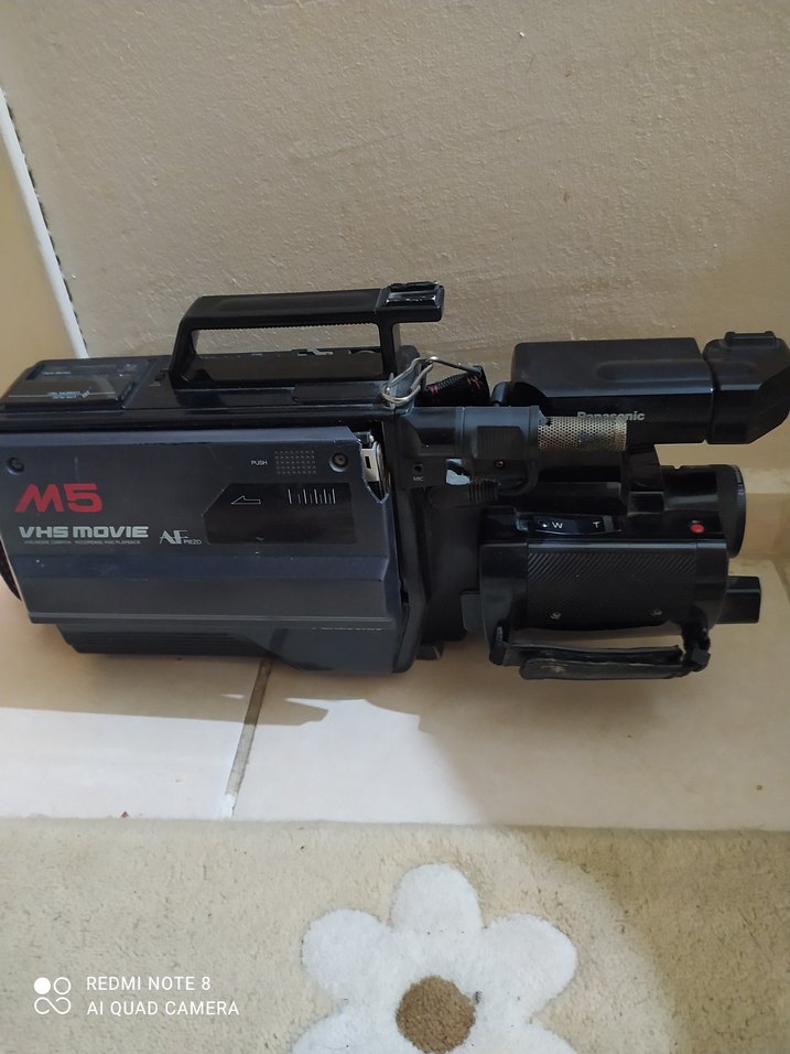 Siyah M5 VHS film kamerası, tutma sapı ve çoklu kontrol düğmeleriyle. REDMI NOTE 8 AI Quad Camera ile çekilmiştir.