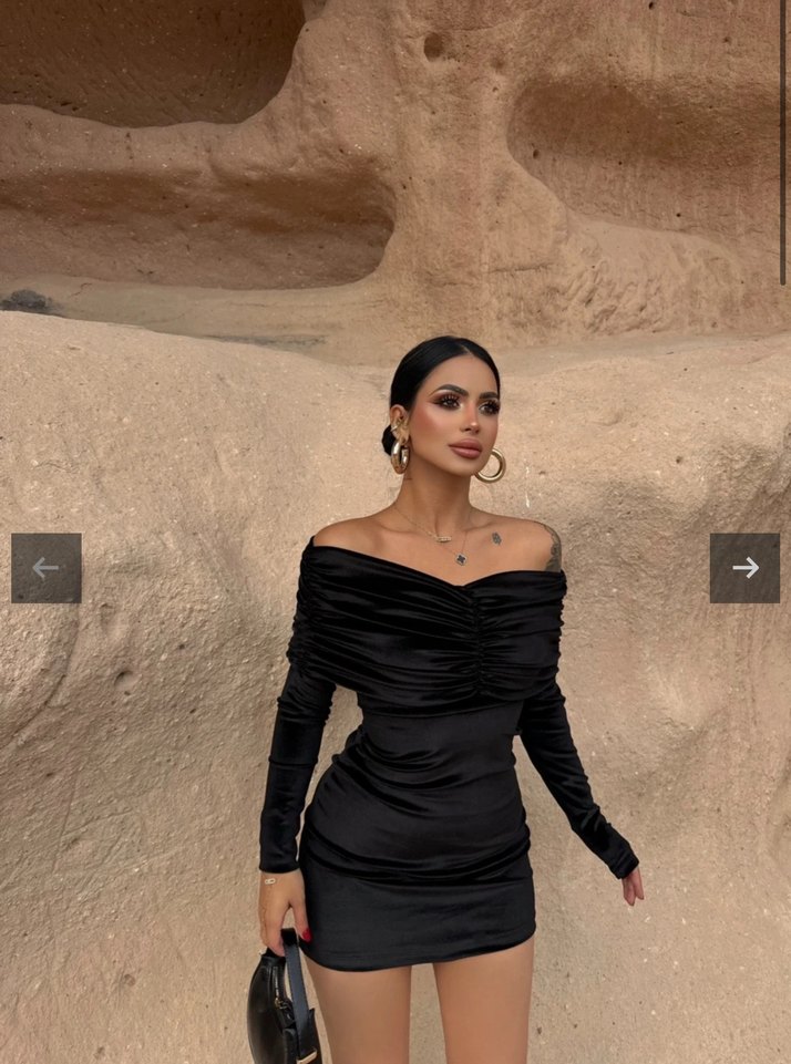 Siyah mini elbise, straplez drapeli madonna yaka ve uzun kollu, yumuşak kadife kumaştan. Gösterişli romantik akşamlar için uygun.